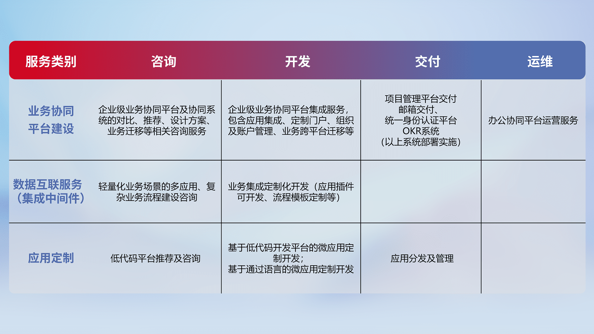 针对钉钉、、、企微、、IDaas等平台级产品提供产品的规划、、、、方案、、交付、、、、定制化开发等服务,,,,实现如统一协同办公、、、、智能客户服务、、、混合会议管理、、智能数据查询、、、等业务场景,,,,实现数字化转型。。。