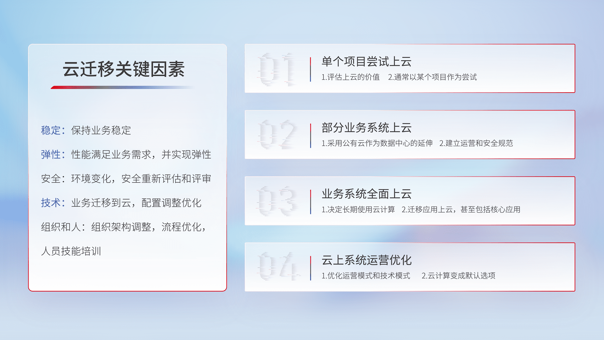 结合实际业务,,,,从规划设计、、、、云平台选型、、、、云原生改造、、、、数据迁移、、集成交付,,迁移全过程为客户识别最佳上云路径,,,,做好风险识别管理,,设计网络架构、、身份权限、、、安全审计合规、、操作审计、、、、日志审计、、、监控告警策略、、、、多站点容灾设计等,,,对云上基础设施进行整体规划,,,,提升IT治理水平,,以满足弹性、、、、高可用、、高性能的需求。。。。