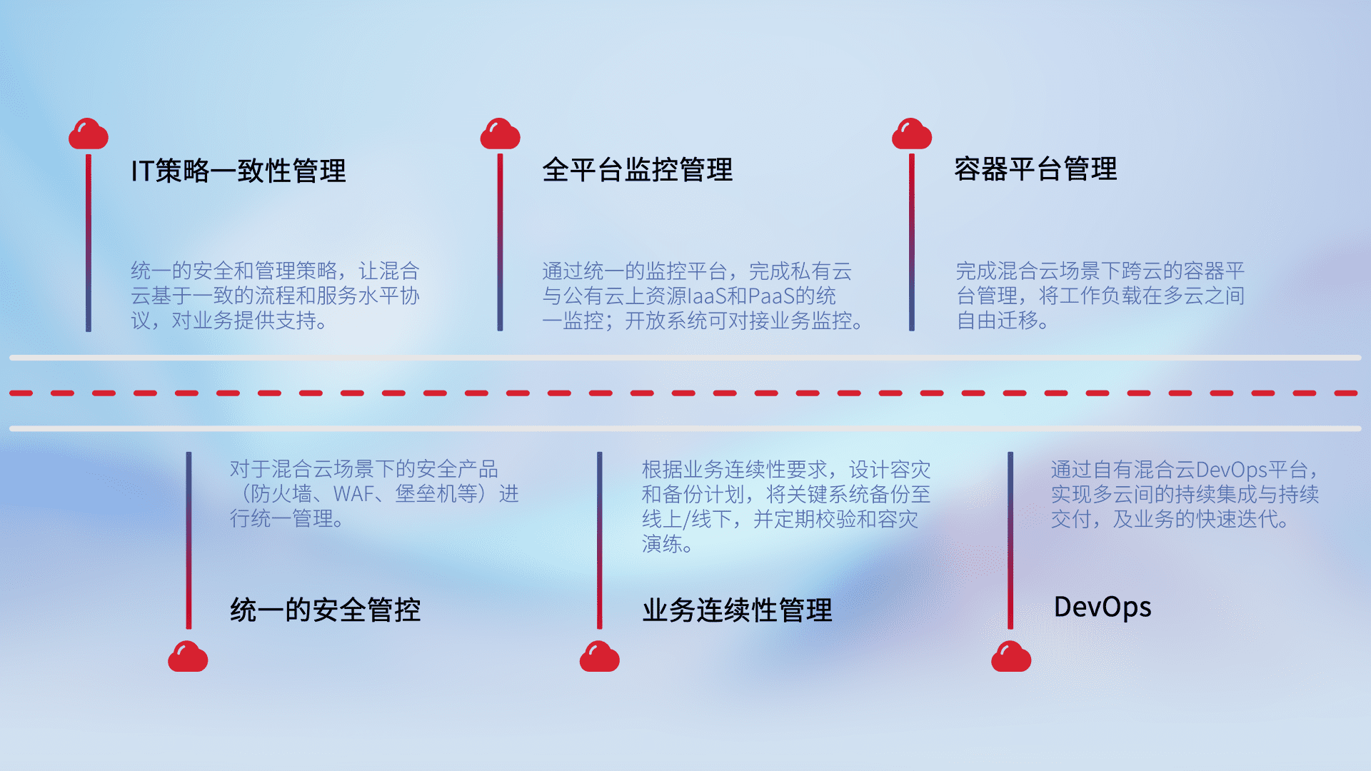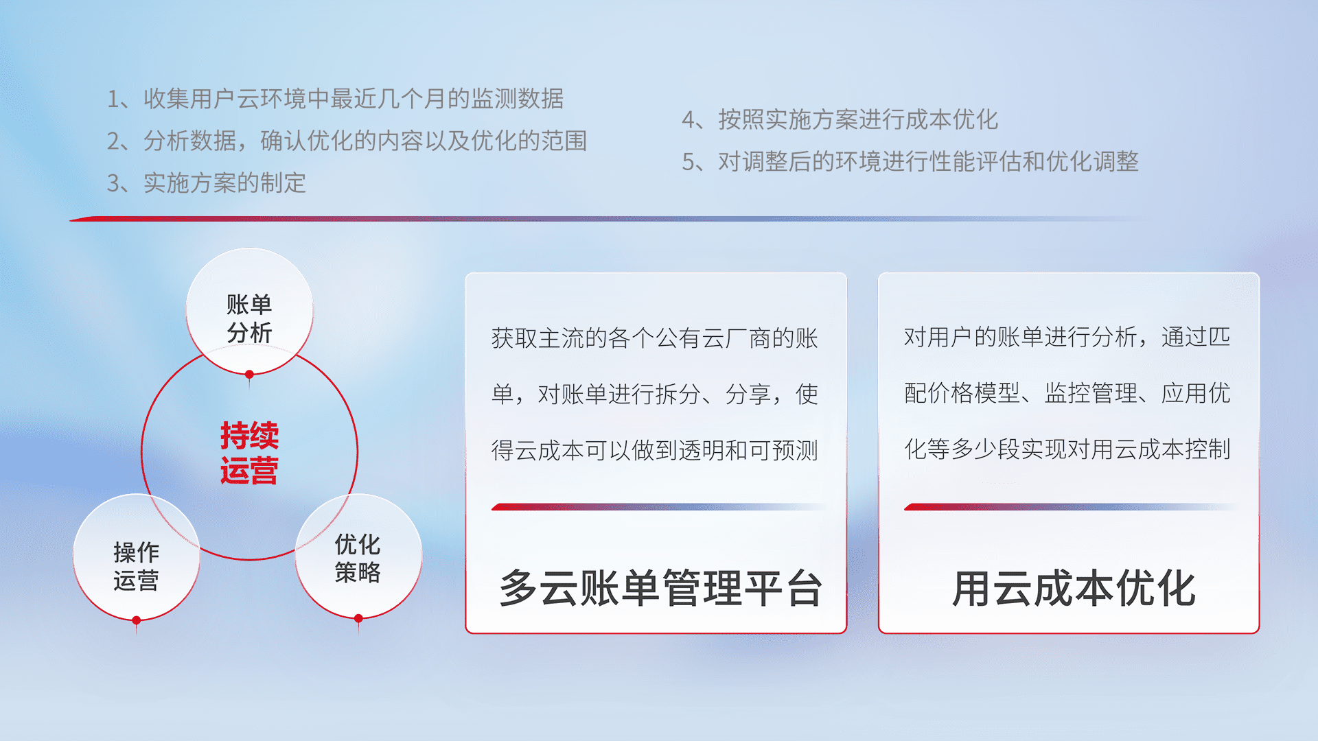 通过多云纳管,,,以统一的资源数据模型把客户的云资源进行抽象和封装,,,,进而实现对多云资源的统一操作,,,保障云资源管理的可靠性、、稳定性与可用性。。。。量身定制化运维内容,,配置、、、开发运维、、、补丁管理、、备份、、、、监控、、、认证和访问管理、、、、审计和日常巡检等,,,保障在用云过程中的可靠度,,,稳定度以及高可用率。。。