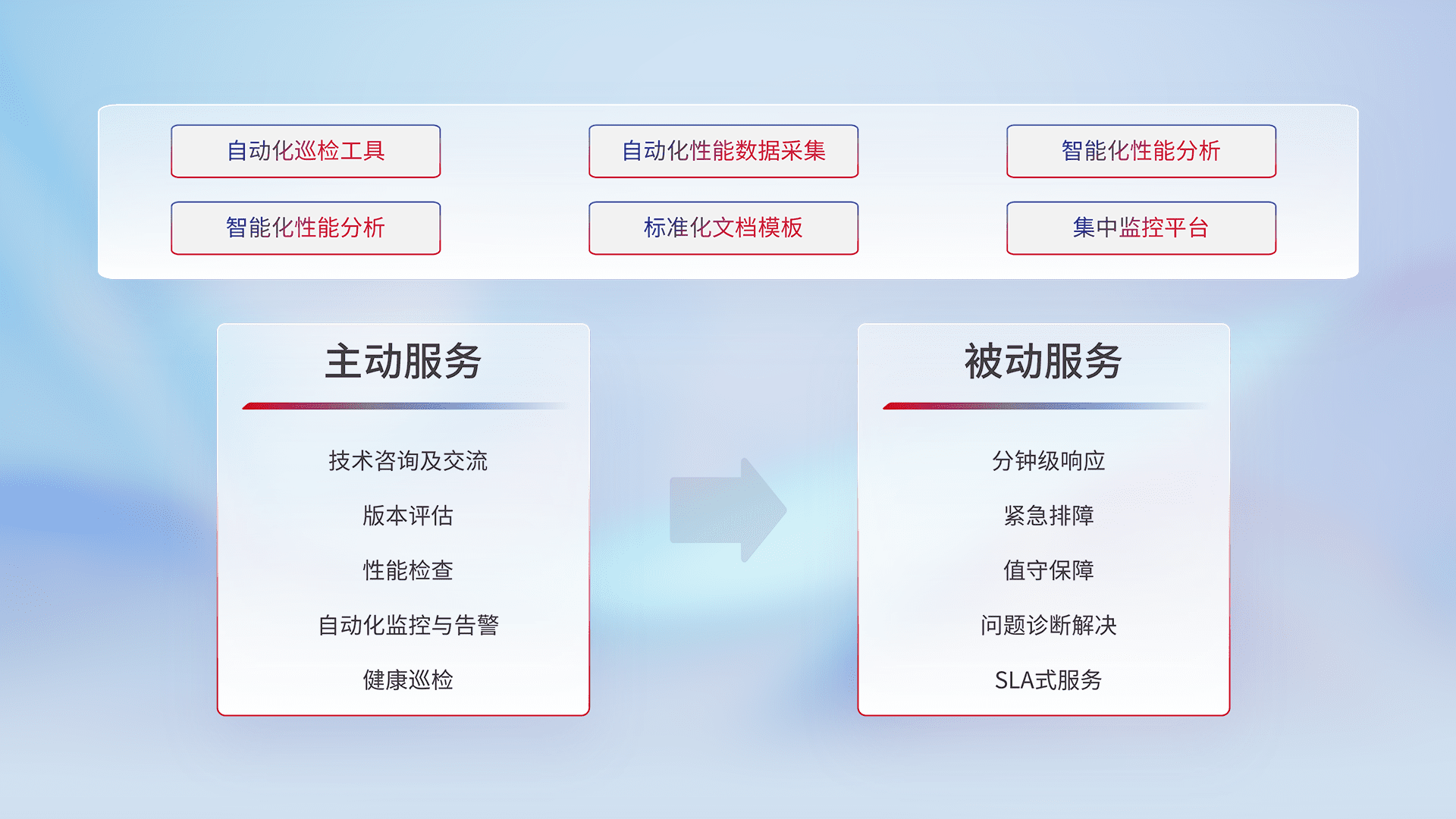 智能化工具和标准化文档,,,,保障服务质量,,,提供主动服务(包含技术咨询、、版本评估、、性能检查、、自动化监控与告警、、健康巡检)和被动服务包含(分钟级响应、、、、紧急排障、、值守保障、、、问题诊断解决、、、SLA服务)。。。